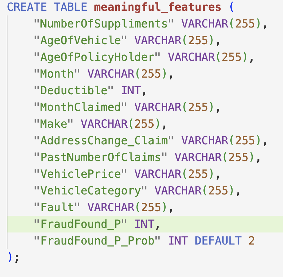 And I also added a default column for FraudFound_P_prob just in case the user wants to get probabilities when they run a pred model.I uploaded 2 datasets to postgres - the above one, and one ready for the balanced random forest classifier model - it is the same as the above one but all vars are in dummies. Given that, I removed all instances in my code where I read data from local sources -> now every instance reads code from the database.